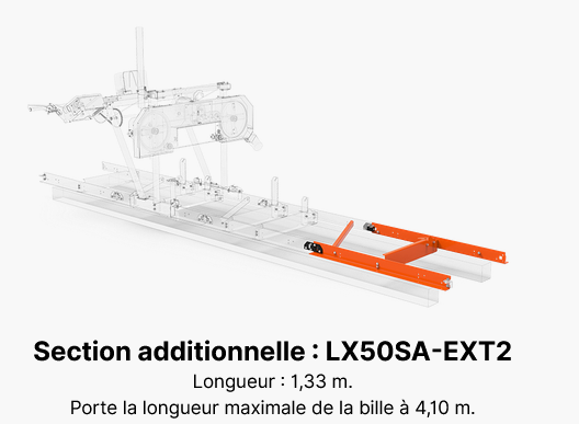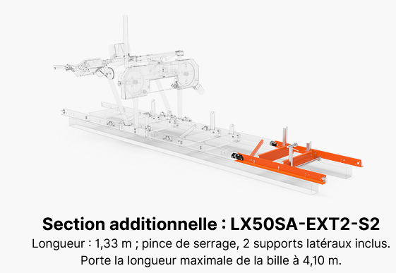 La scierie LX50SUPER permet de scier des billes d’un diamètre allant jusqu’à 66 cm et d’une longueur maximale de 3,70 m ; elle peut être personnalisée pour répondre aux besoins des utilisateurs en allongeant le banc au moyen de segments additionnels d’une longueur de 1,53 m chacun.